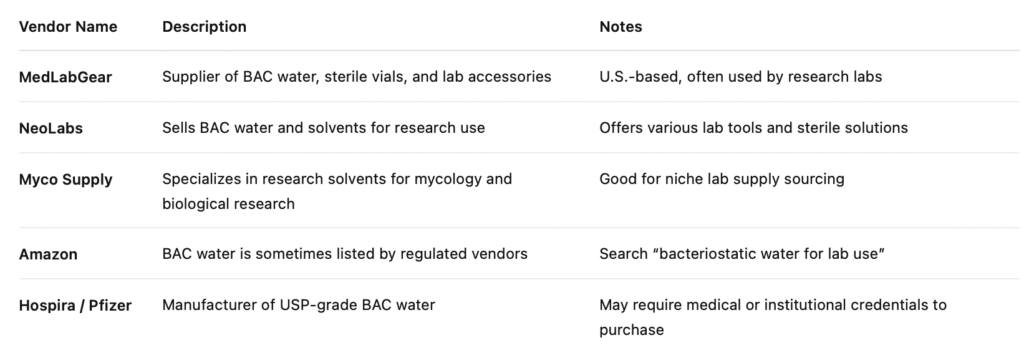 The following vendors offer BAC water for laboratory or veterinary supply purposes. Availability may vary based on location, account status, or institutional documentation.
